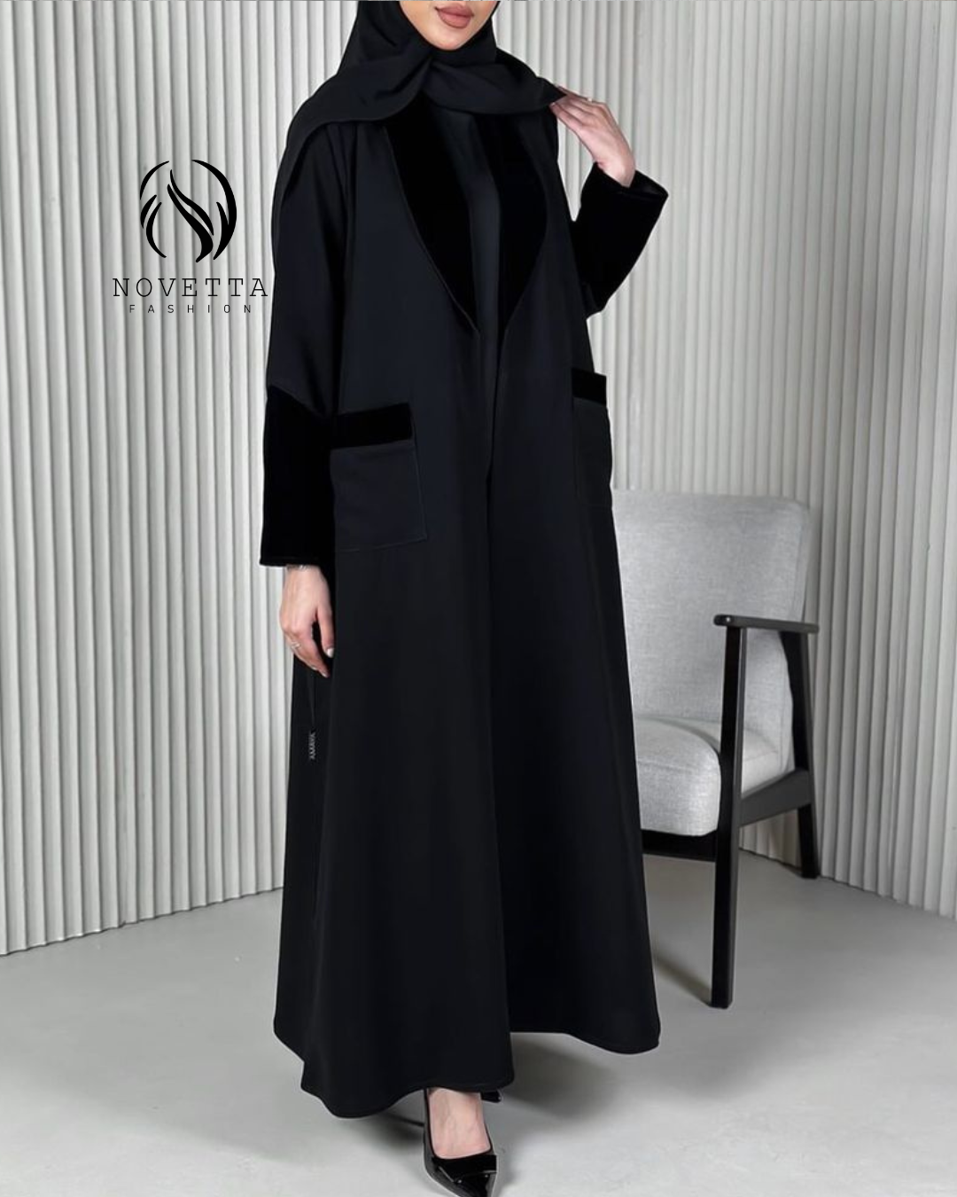 عباية فاخرة بتصميم أسود أنيق ولمسات مخملية راقية تعكس الفخامة الهادئة بأسلوب عصري بخامة بورتريكو كوري تقيلة وناعمة وسواد داكن مع مخمل سلك والمقاسات وافية واسعة