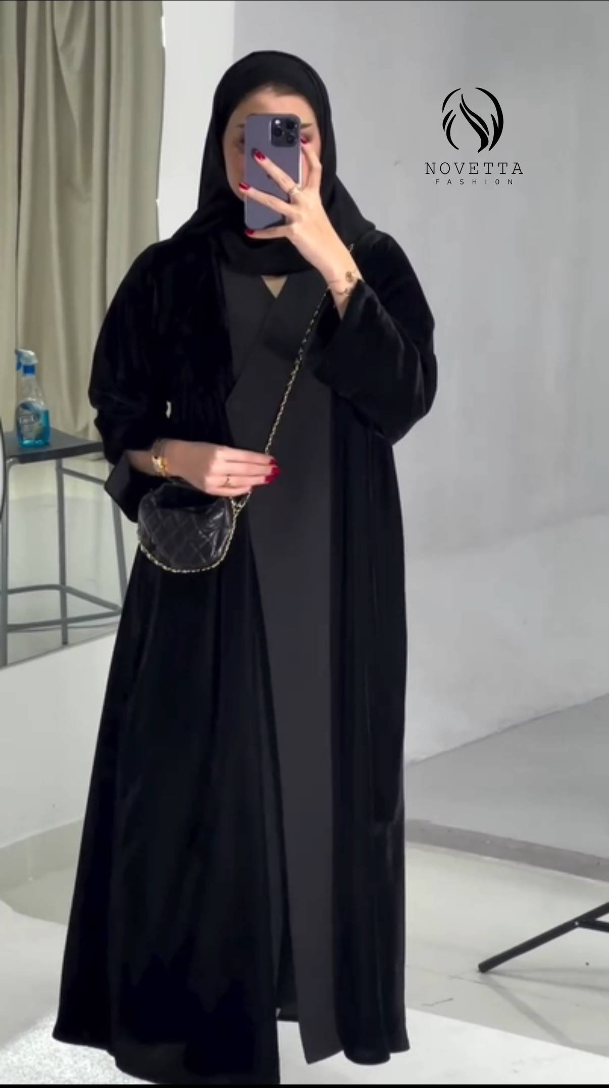 عباية مخمل فاخرة بتصميم ناعم يجمع بين البساطة والفخامة، تمنحك دفء وأناقة خريفية لا تُقاوم.بخامة مخمل ليكرا وسواد داكن مع بورتريكو تقيلة والمقاسات وافية وواسعة