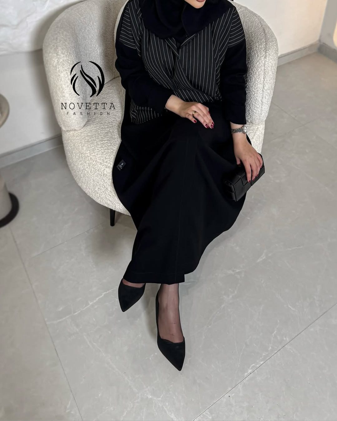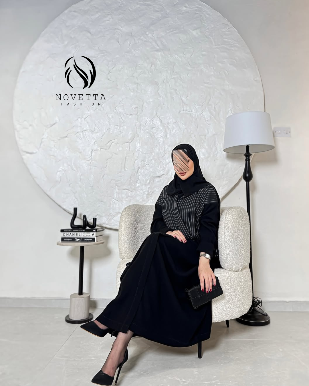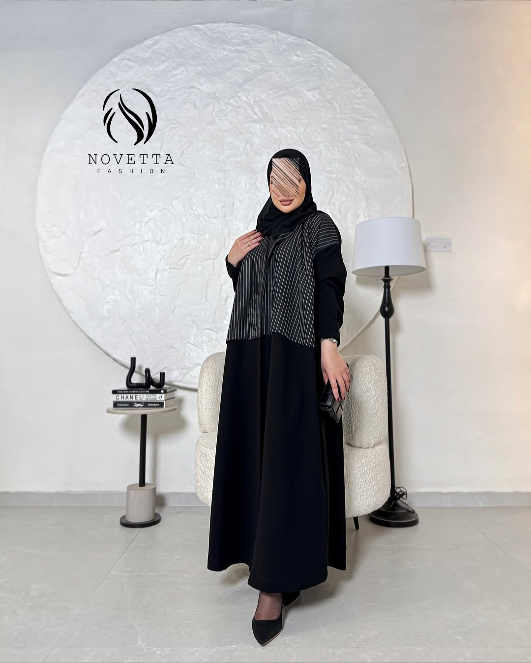 عباية خريفية أنيقة بتصميم راقي يجمع بين القماش السادة ولمسة مخططة راقية على الصدر، تعطي إطلالة عملية وفخمة في نفس الوقت، مناسبة للمكتب والخروج الراقي.بخامة كوبرا اندونيسي هددلة وناعمة وسواد داكن مع قماش مقلم عالصدر