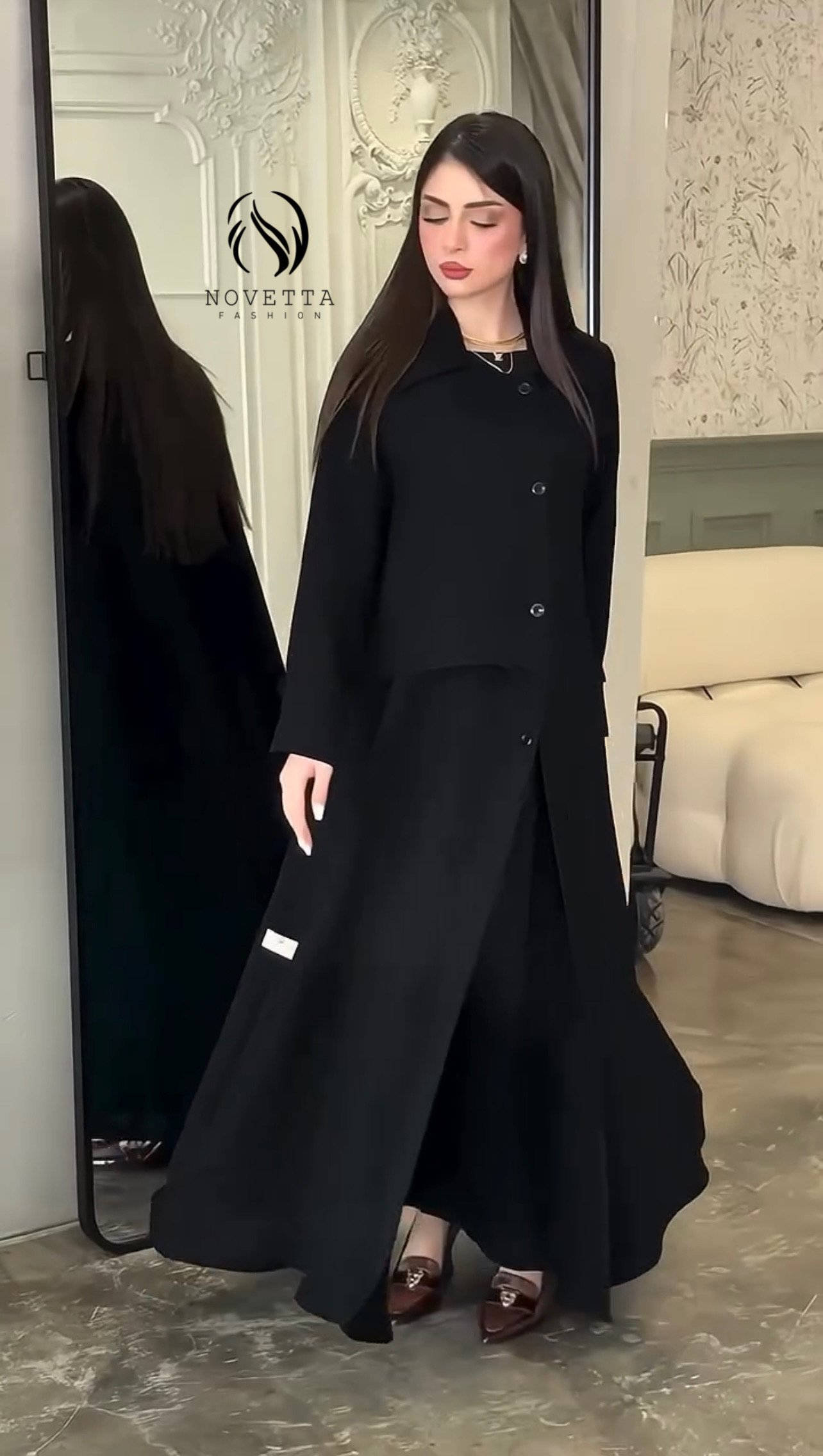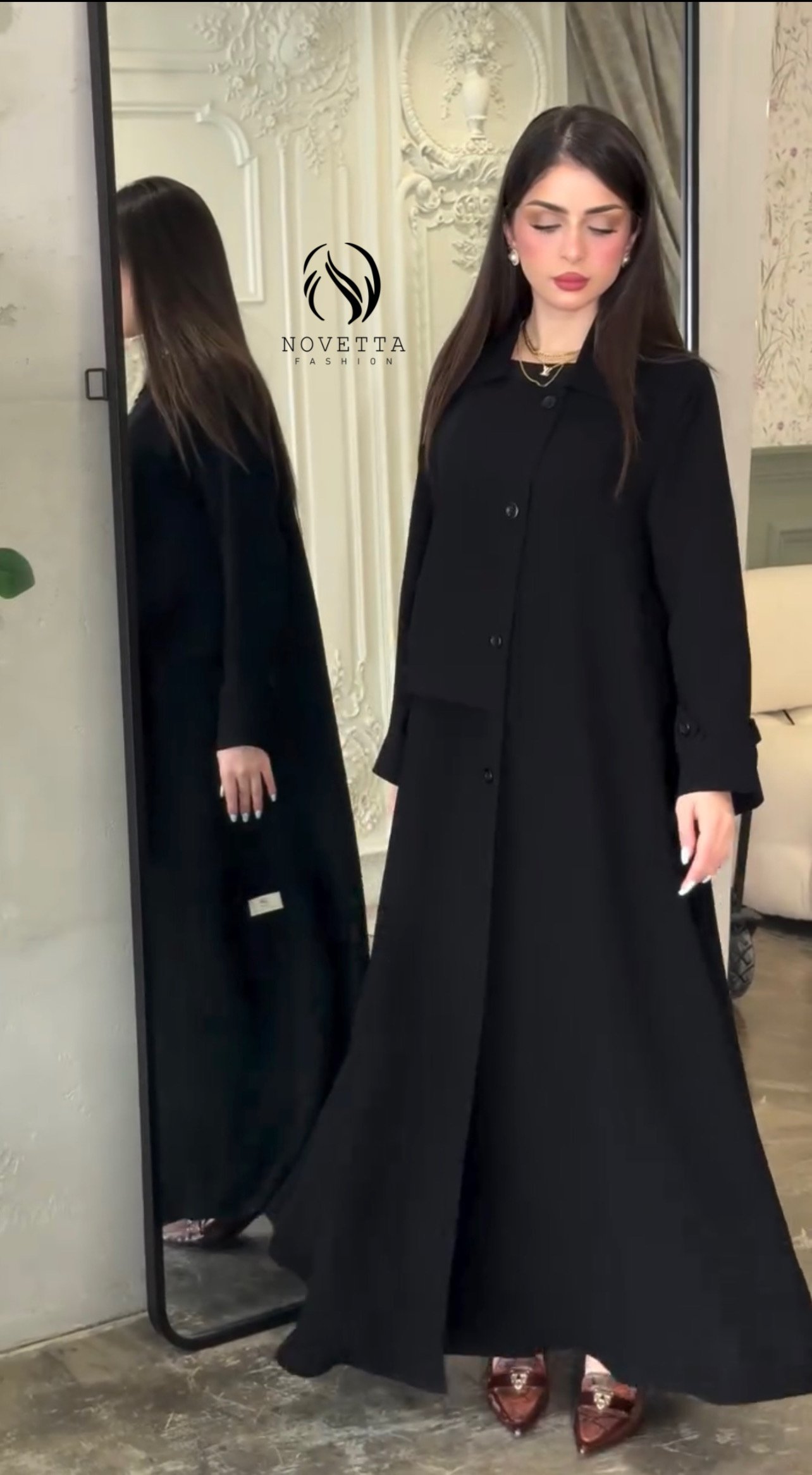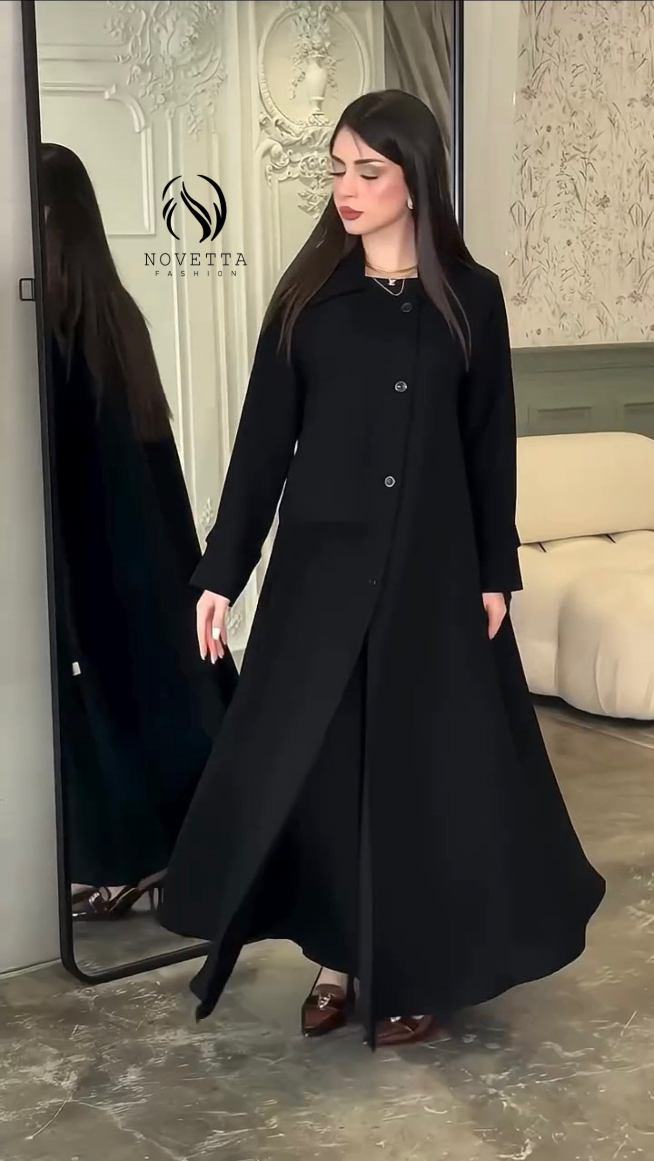 عباية فاخرة بتصميم انسيابي راقي، تجمع بين البساطة الراقية والقصّة العملية. خامة مريحة، وشكل مرتب يناسب الإطلالات الرسمية والجامعة والعمل. بخامة كريب كوري تقيلة وناعمة وهدلة وسواد داكن والمقاسات وافية واسعة