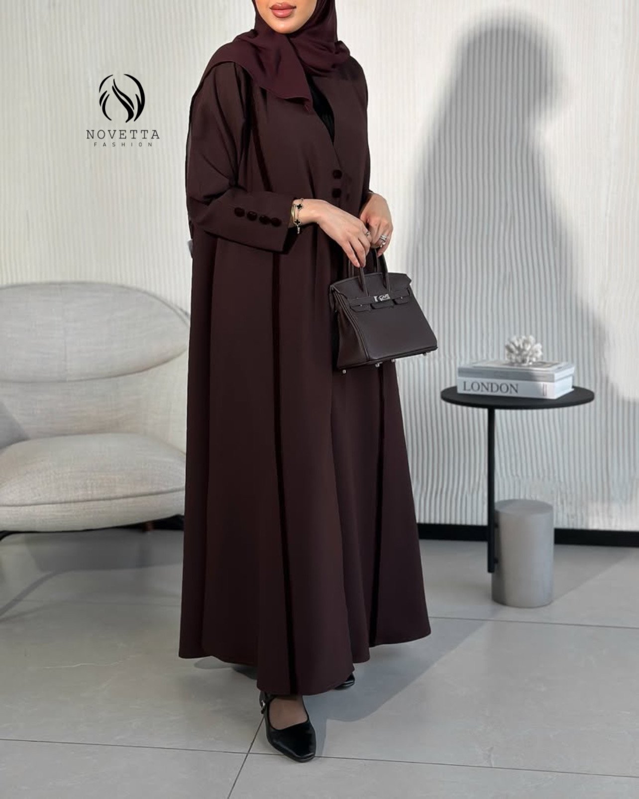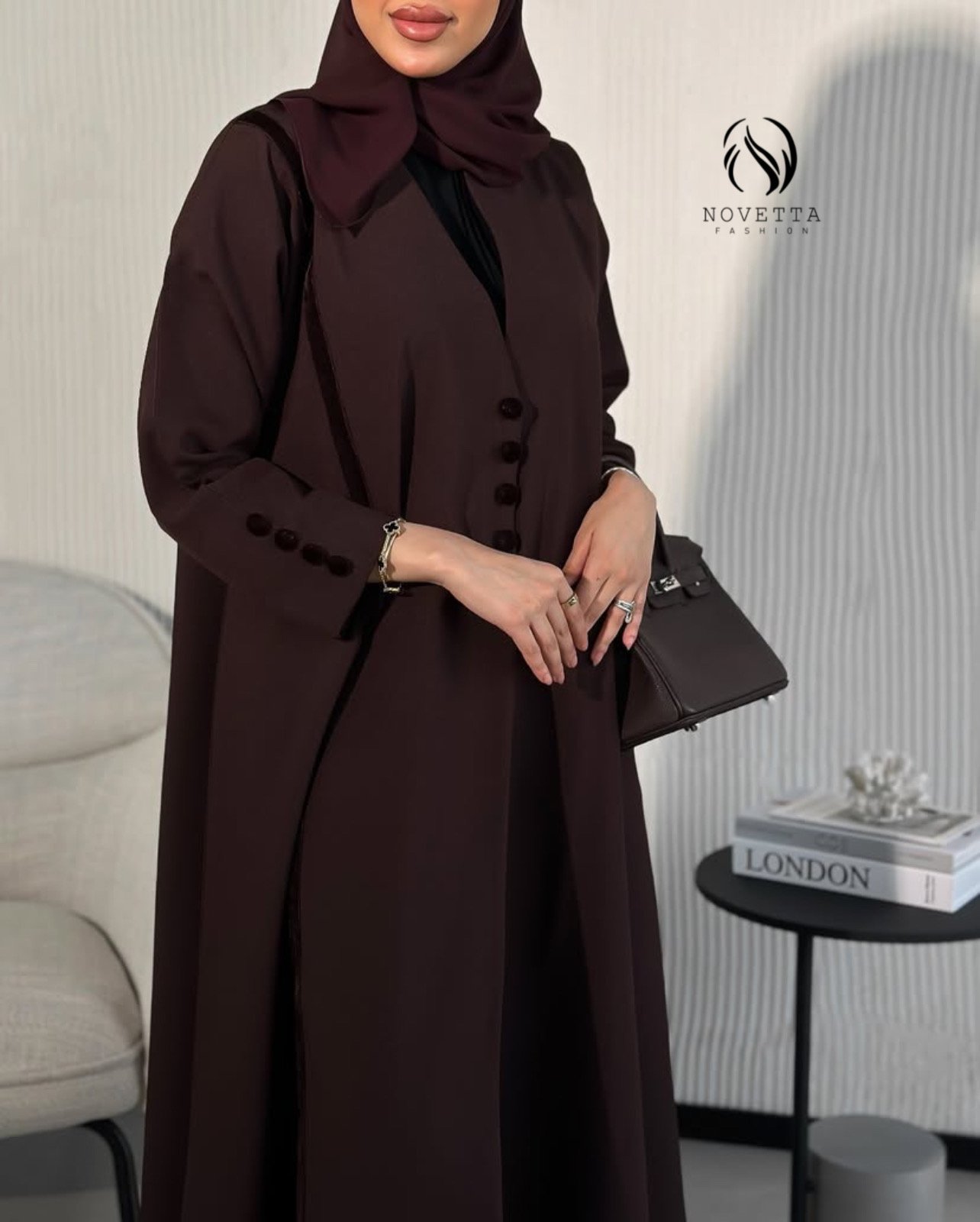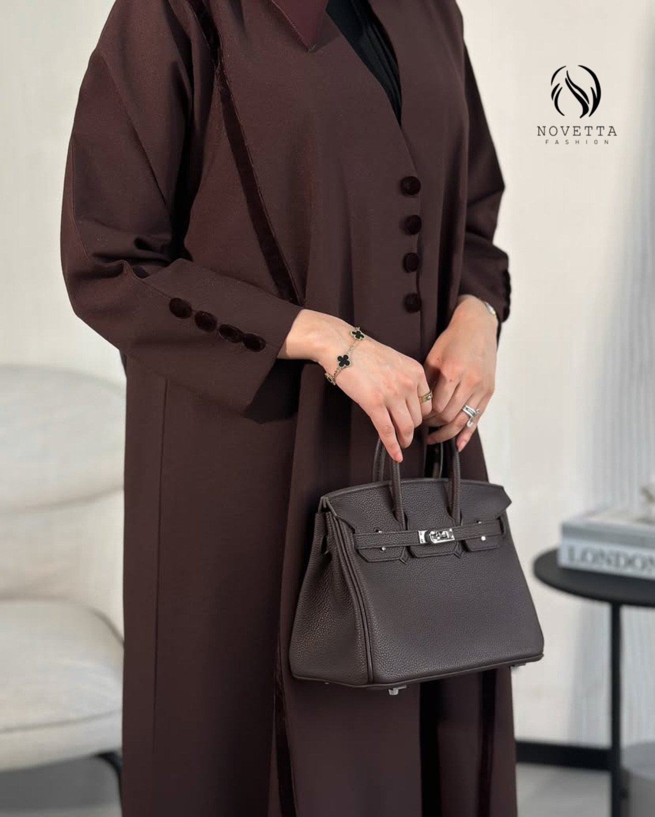 عباية رسمية بلون بني داكن، مصممة بخطوط مخملية ناعمة وأزرار مكسوة تضيف لمسة فخامة هادئة. قصة واسعة وانسيابية مناسبة للعمل والمشاوير الرسمية،بخامة باربي هدلة وناعمة وتقيلة مع مخمل بني والمقاسات وافية واسعة