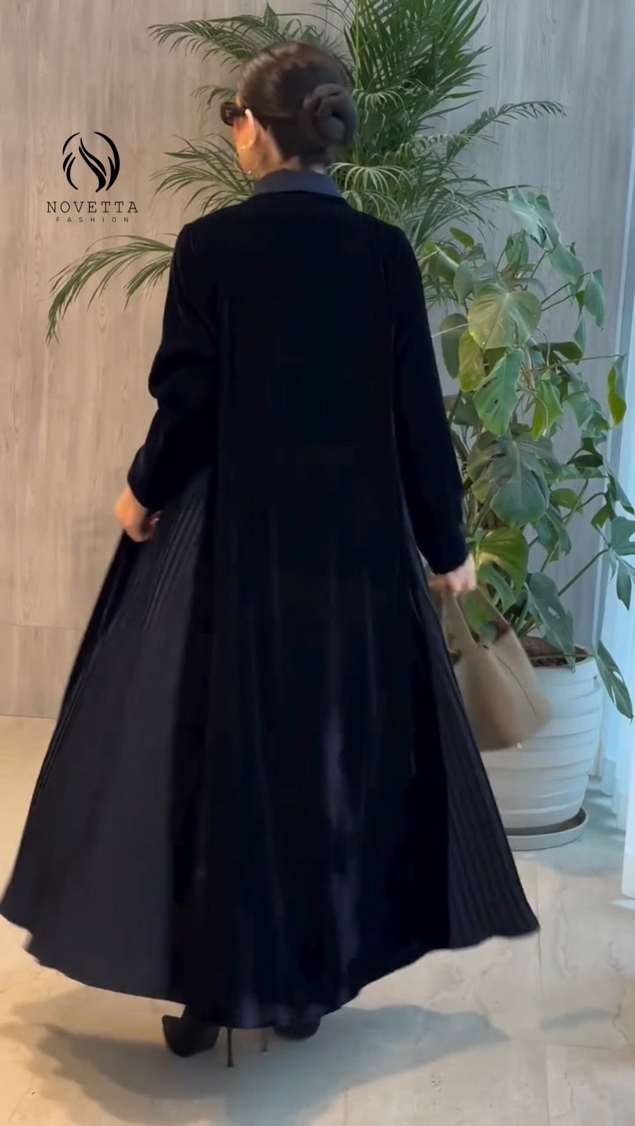 تصميم يجسّد التوازن بين الانسياب والقوّة،جوانب بلاسيه ناعمة تنساب بخفّة مع كل حركة،يقابلها حزام جلدي فاخر يحدّد الخصر بدقّة وأناقة.قصّة مدروسة تمنح حضورًا راقيًا،وتفاصيل مختارة بعناية لتصنع إطلالة هادئة… لكنها لافتة,بخامة مخمل ليكرا اسود مع جوانب بلاسيه كريب اندونيسي هدلة وناعمة وسواد داكن,موديل يعكس فخامة معاصرة لا تخضع للزمن.