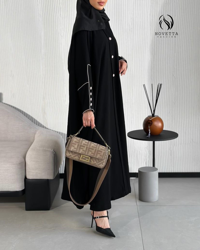 موديل يجسّد الأناقة الهادئة بكل تفاصيلها، عباية سوداء بتصميم انسيابي راقٍ ينسدل بنعومة ليمنحك حضورًا مهيبًا. تزيّنها أزرار بيج أنيقة تضيف تباينًا فاخرًا ولمسة دافئة تعكس الذوق الرفيع.