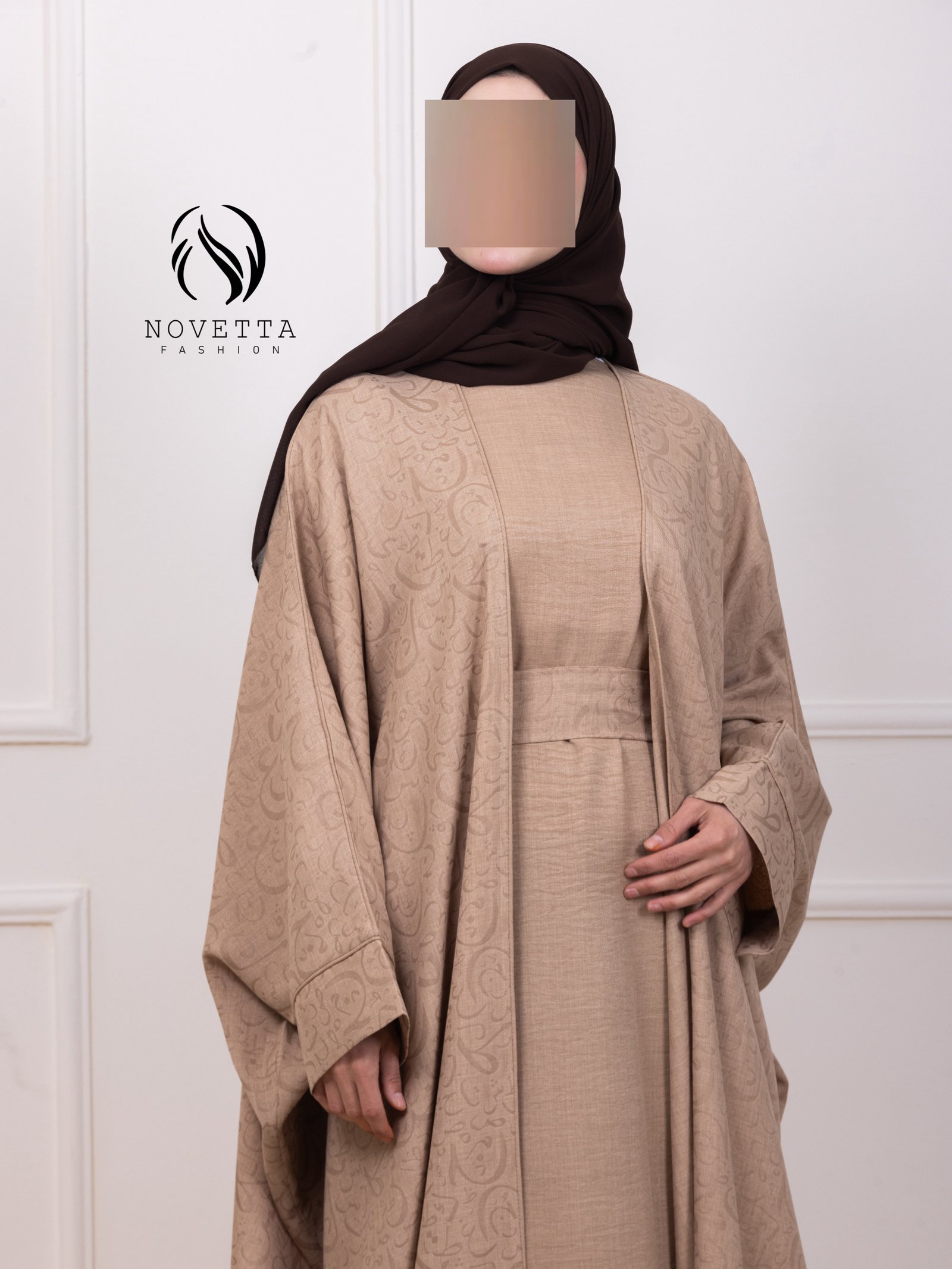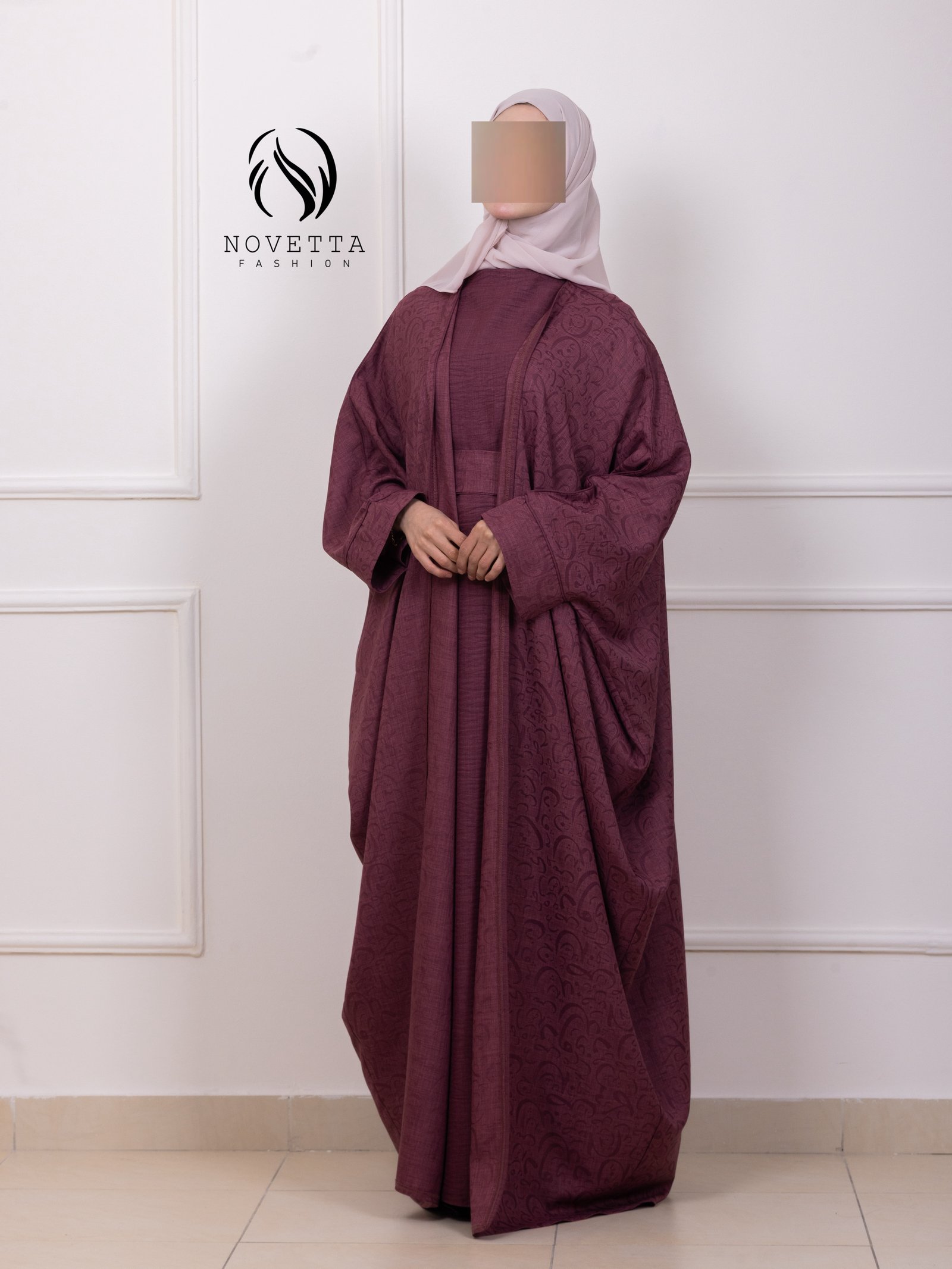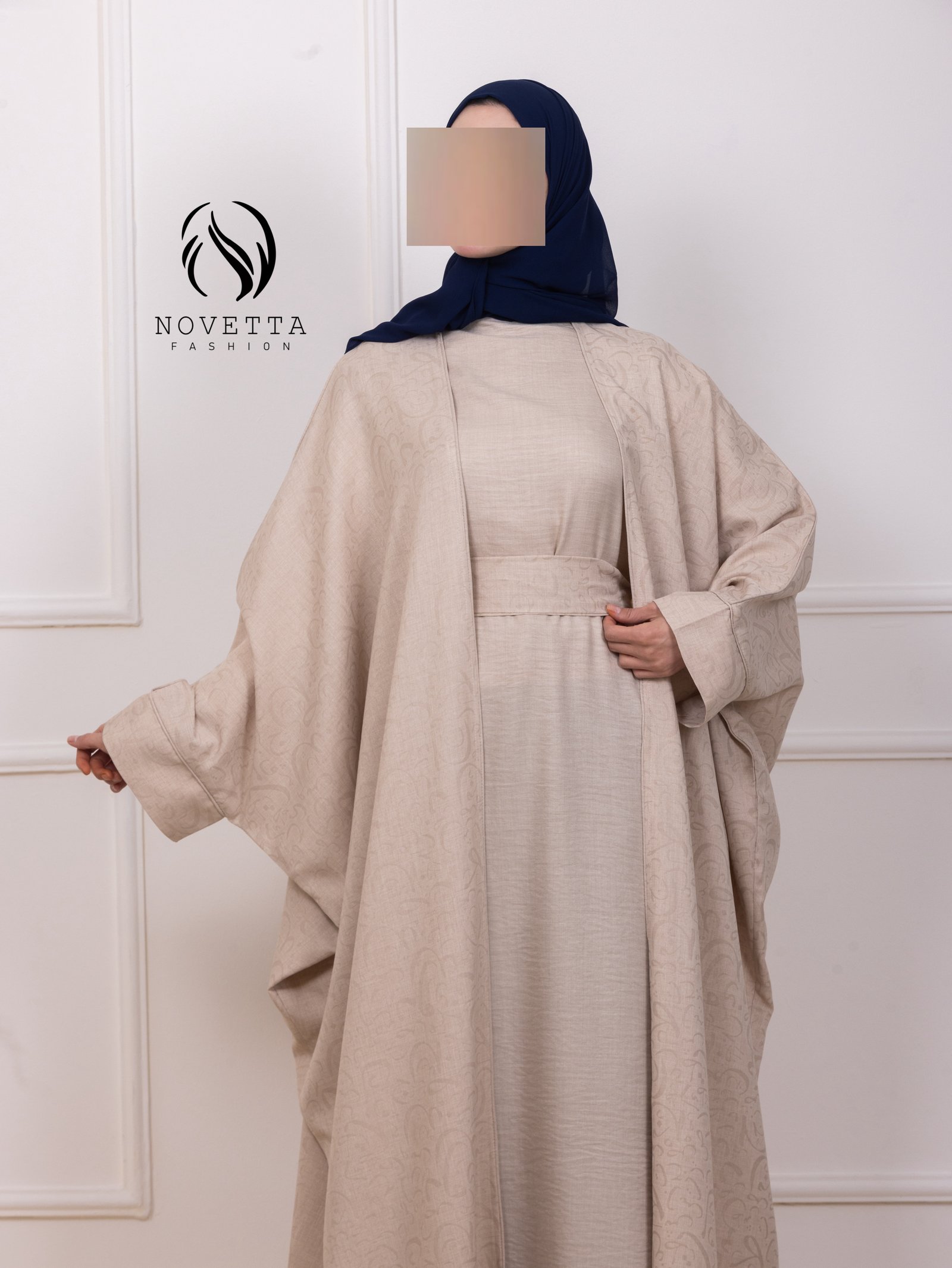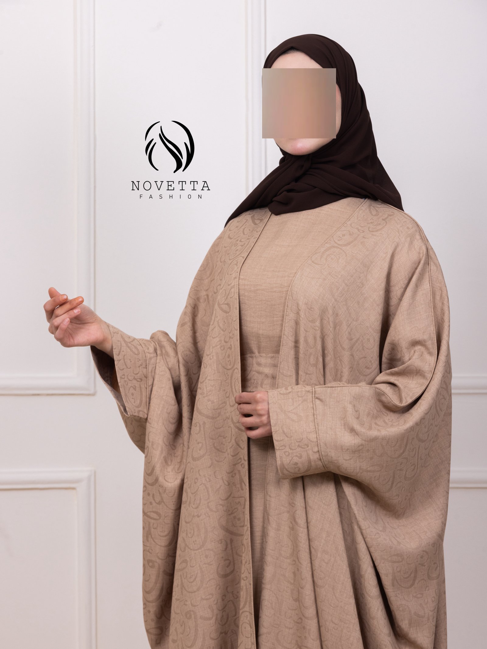 بشت بانسياب راقٍ ينسدل بهدوء ملكي، مصاغ بقصّة واسعة تمنحك حضورًا آسرًا وخطوة واثقة بخامة ملنج احرف