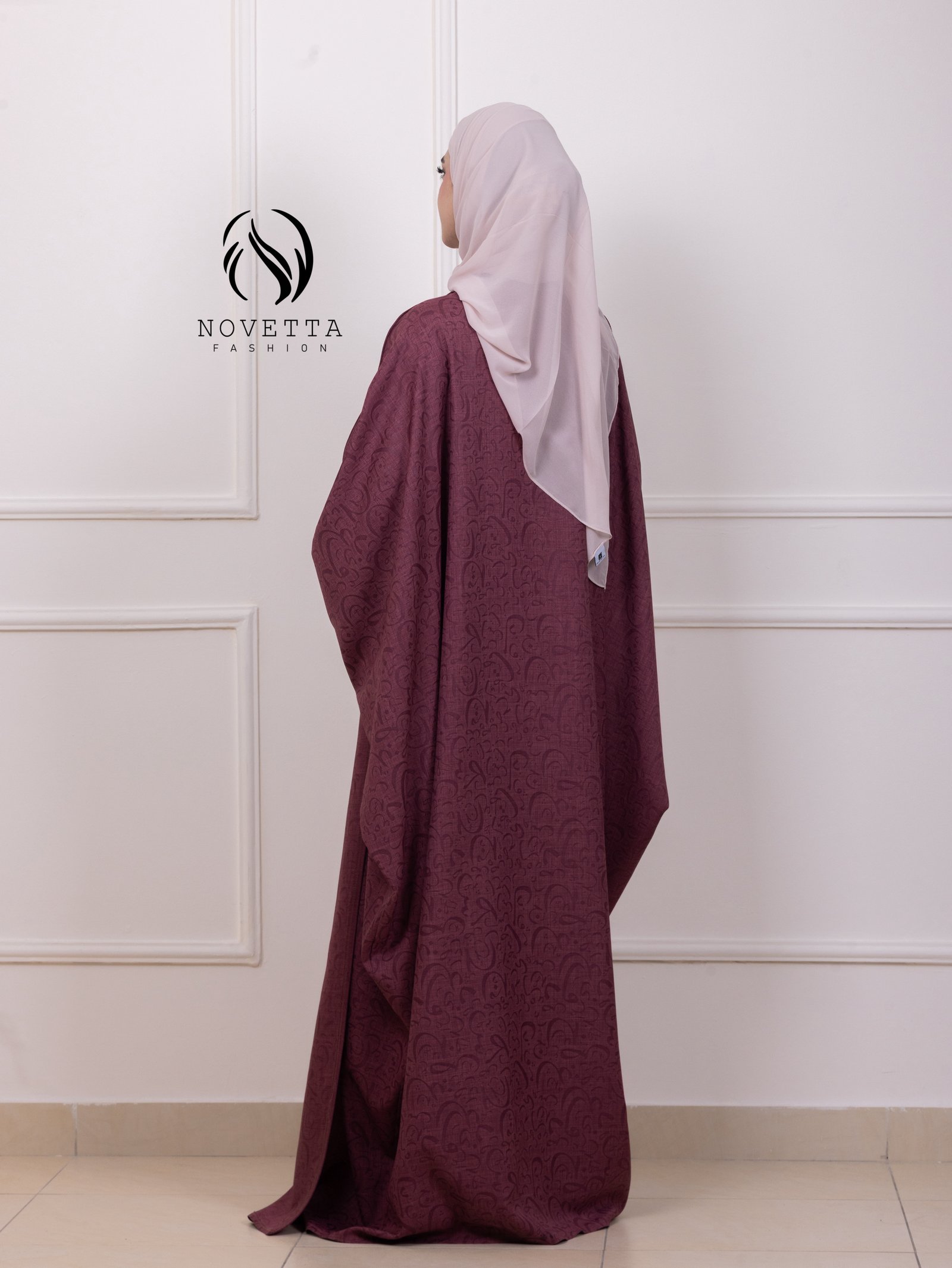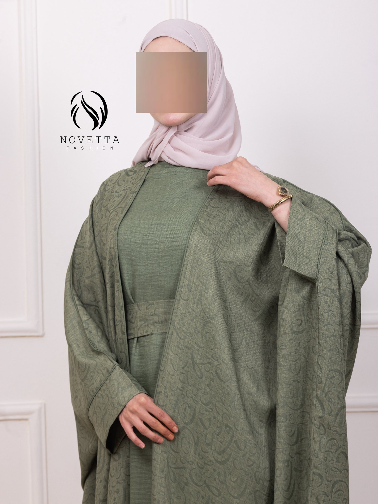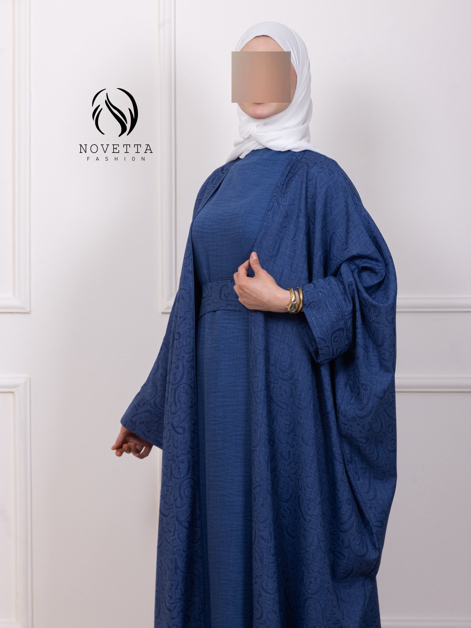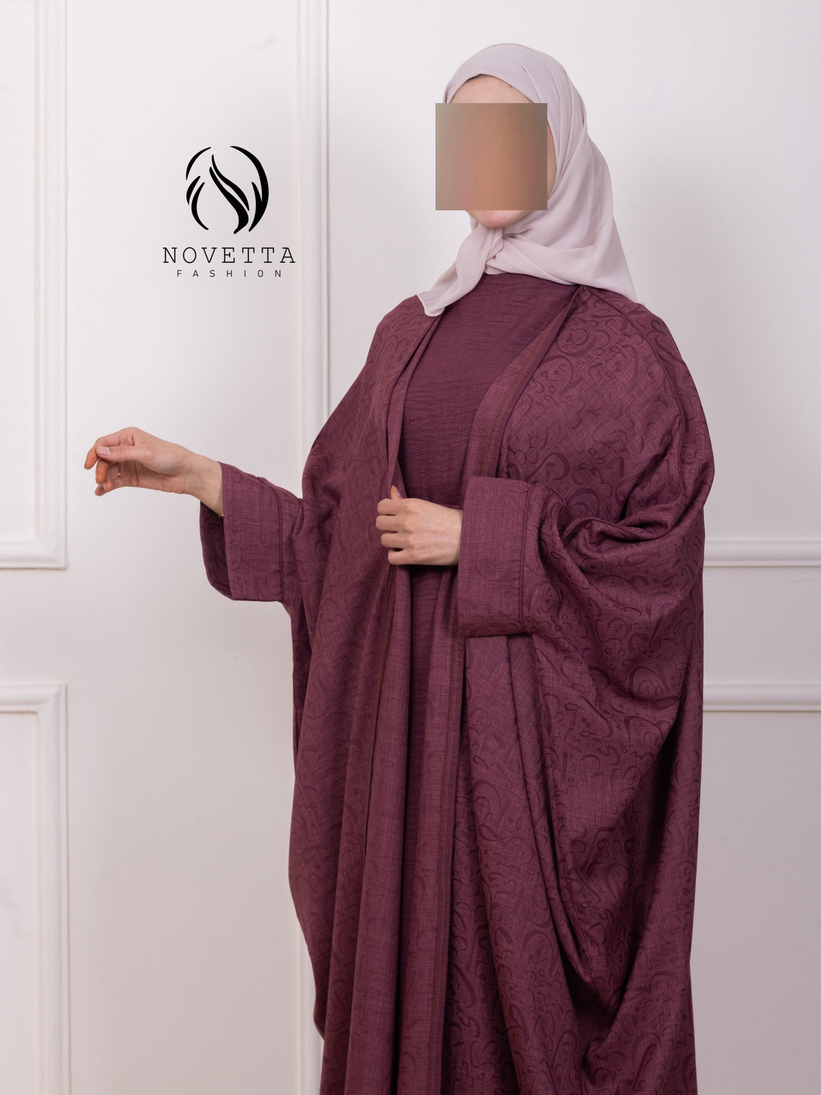 بشت بانسياب راقٍ ينسدل بهدوء ملكي، مصاغ بقصّة واسعة تمنحك حضورًا آسرًا وخطوة واثقة بخامة ملنج احرف