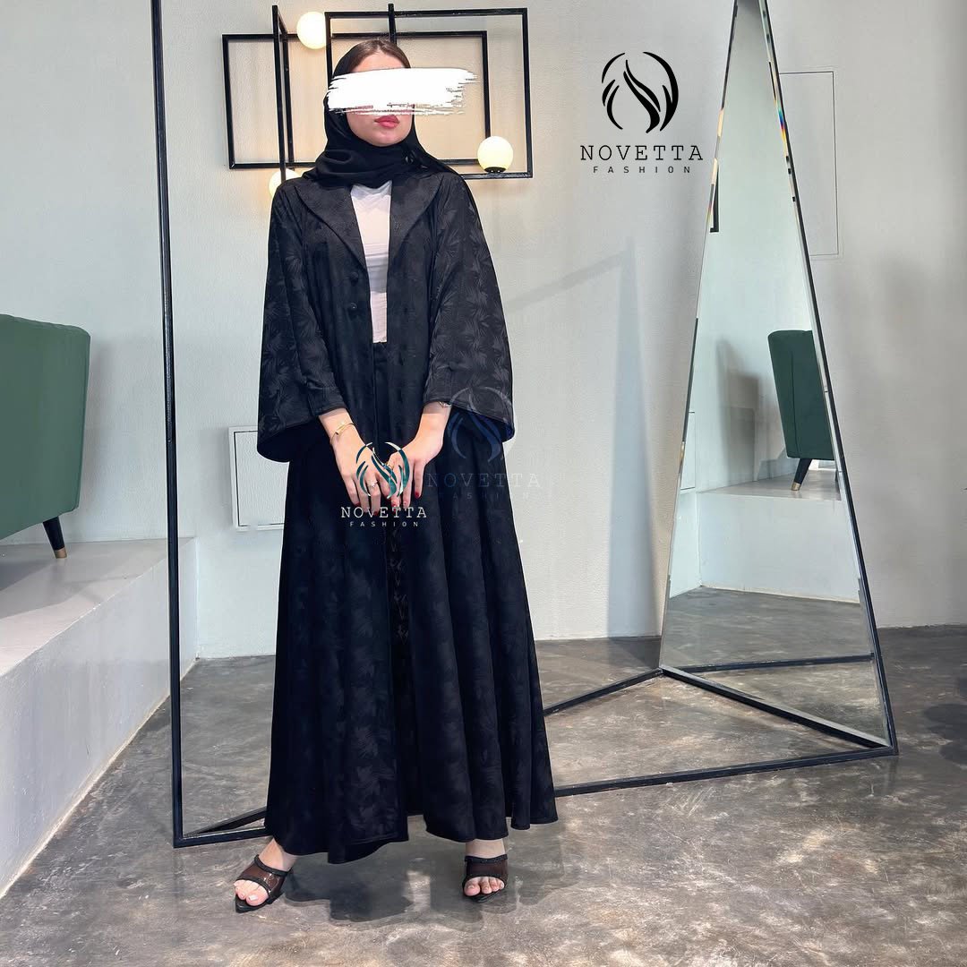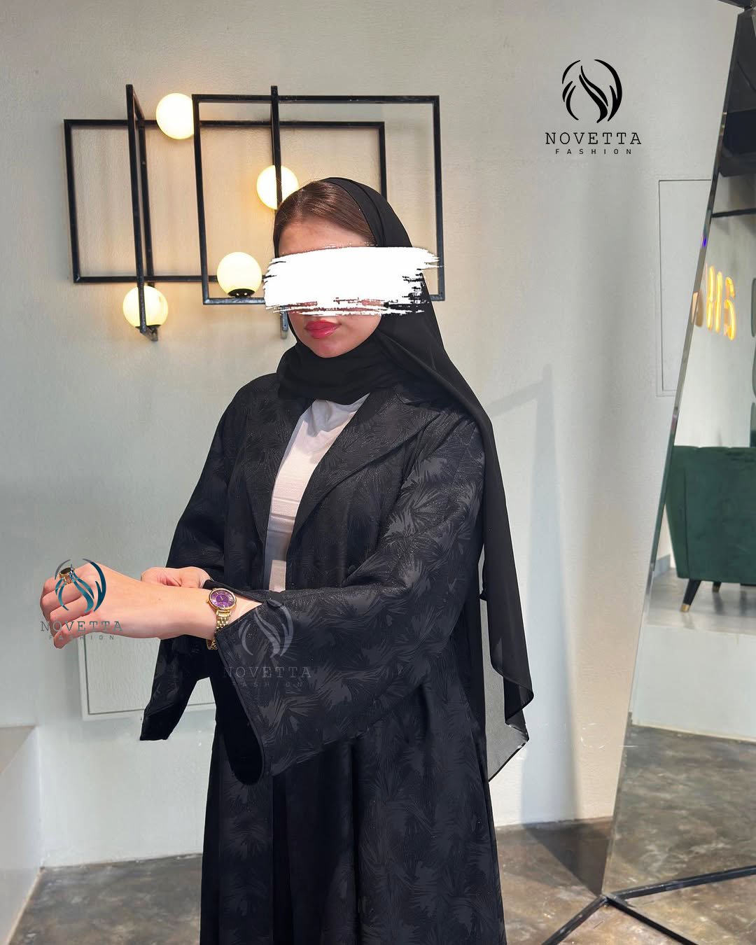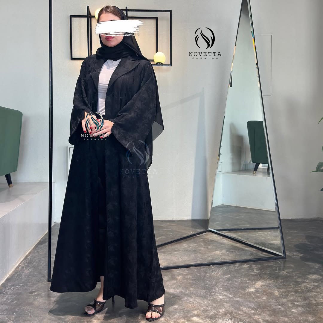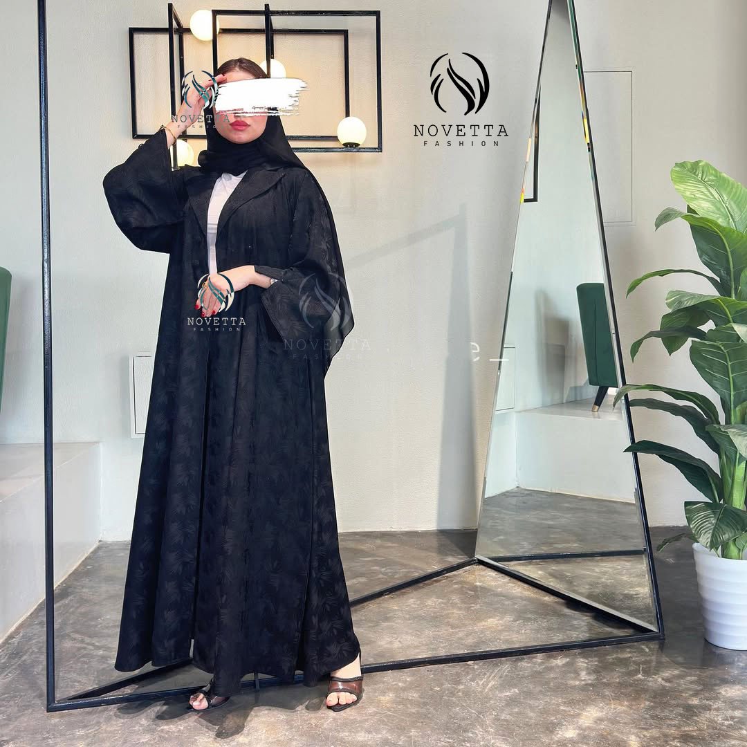 عباية سوداء فاخرة بنقشة ناعمة مستوحاة من أوراق النخيل، بخامة عباي خليجي منقشة اسود داكن ب مقاسات وافية و واسعة