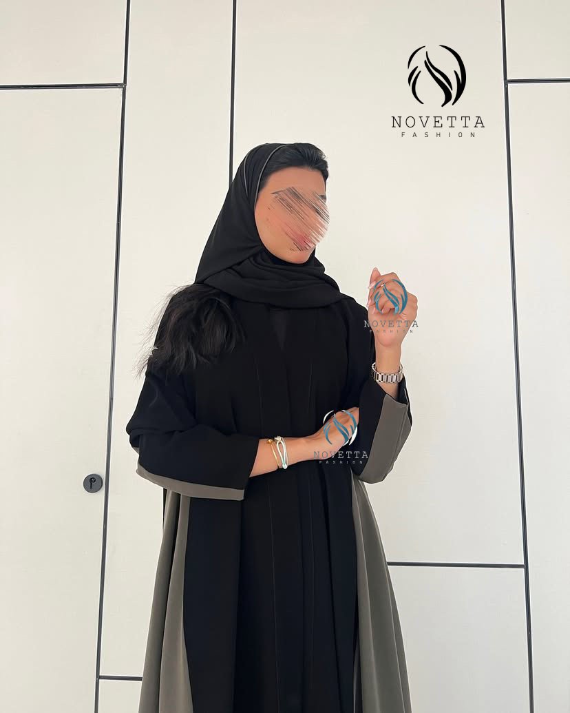 عباية أنيقة بتصميم طولي يجمع بين الأسود العميق والزيتي الغامق، تمنحك إطلالة فاخرة بخامة كريب اندونيسي والمقاسات وافية و واسعة