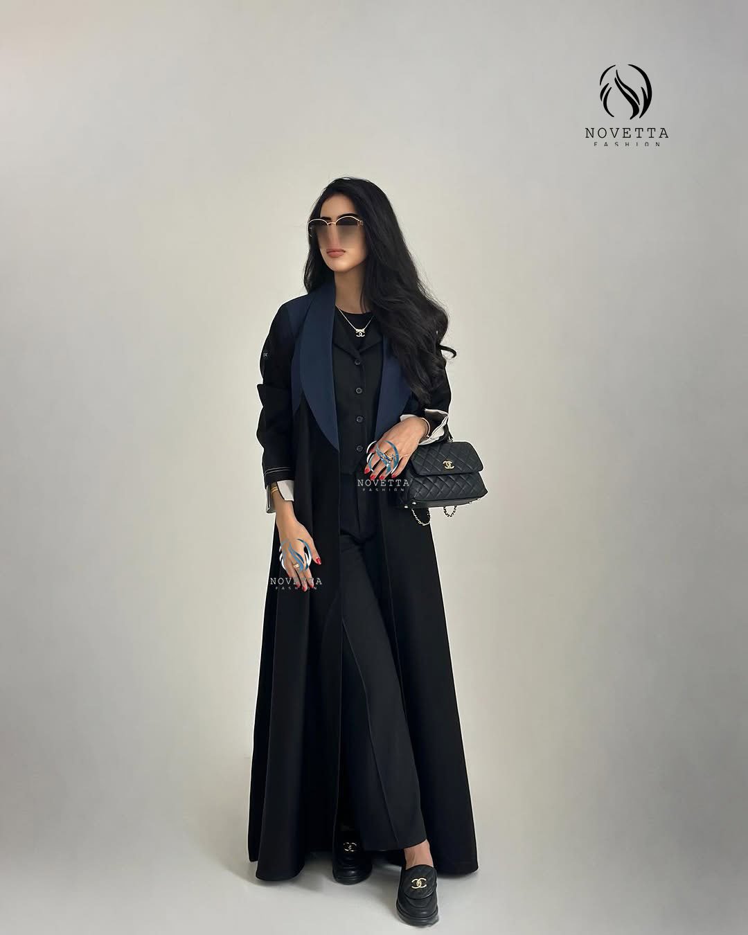 بليزر بتفصيل كلاسيكي مميز، بلمسة صدر جنزاري أنيقة تضيف عمق وجاذبية للعباية. تصميم يجمع بين القوة والرقي.بخامة فكتوريا كوري اسود والمقاسات وافية وواسعة