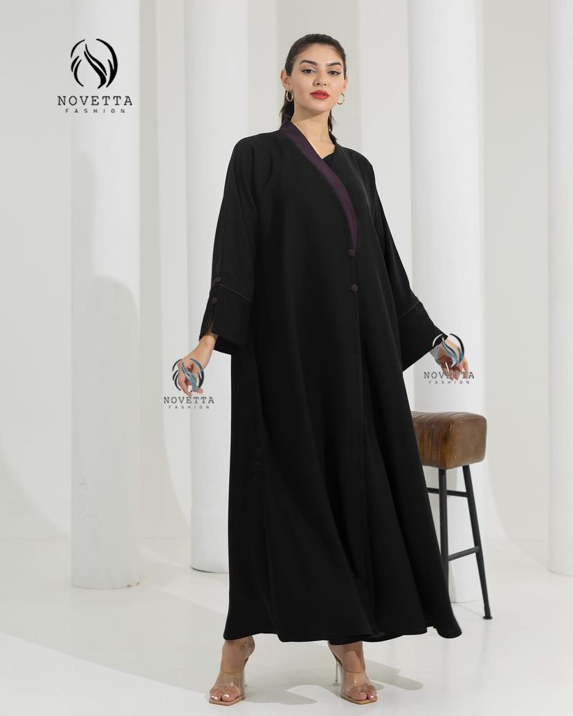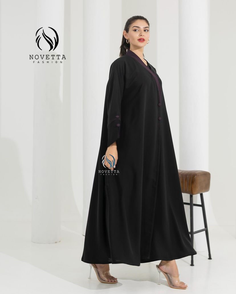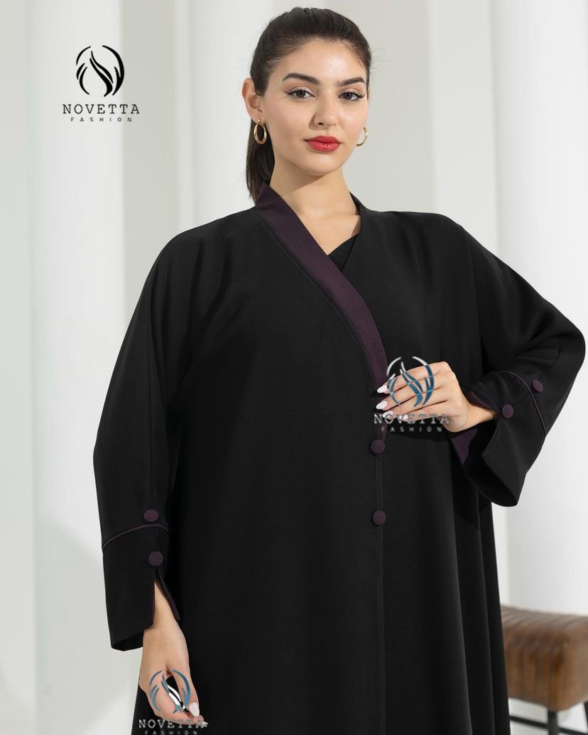 عباية سوداء عملية وأنيقة، بلمسة نهديّة ناعمة على الأزرار والطرف. تصميم كلاسي فخم بلمسة أنثوية ناعمة.