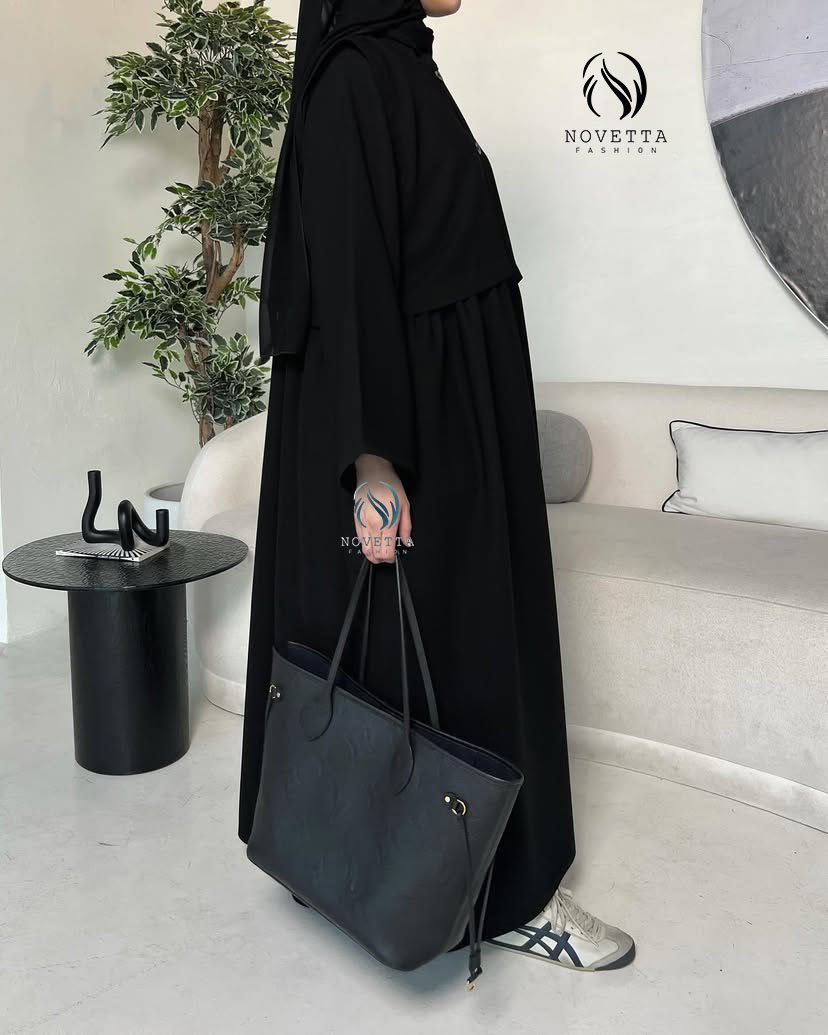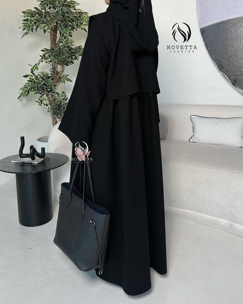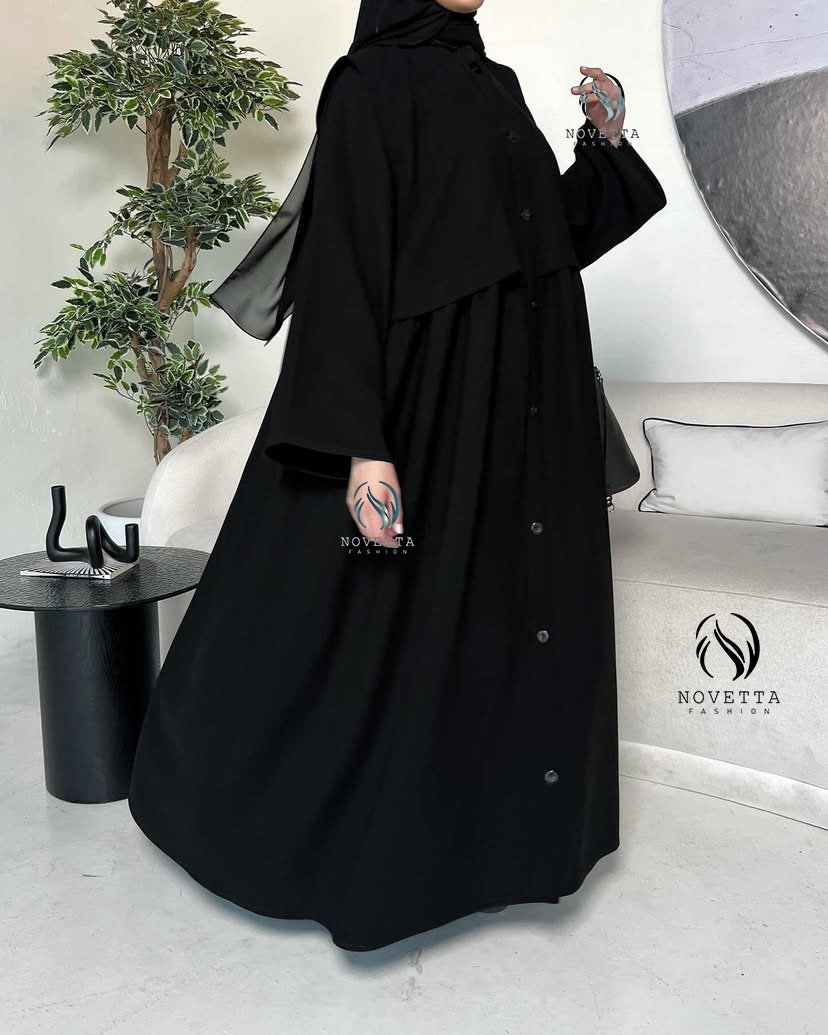 عباية سوداء أنيقة بتفصيل كاب علوي يعكس فخامة التصميم وهدوئه، مصنوعة من خامة ناعمة وعالية الجودة بقصة واسعة وانسيابية.بخامة كريب اندونيسي والمقاسات وافية وواسعة