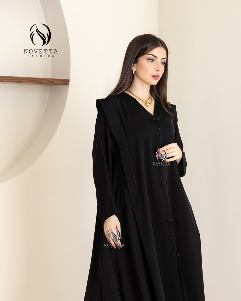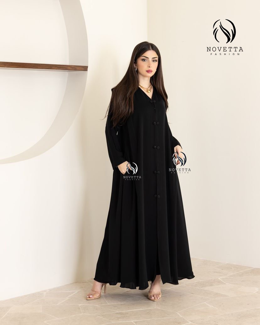 عباية فخمة باللون الأسود الكلاسيكي، تصميم ناعم بأزرار قماشية من الأعلى للأسفل، مع كتف مرفوع أنيق يضيف لمسة ملكية.بخامة اندونيسي تقيل سواد داكن والمقاسات وافية وواسعة