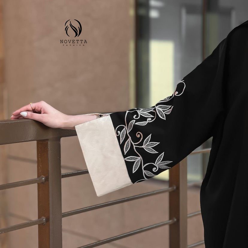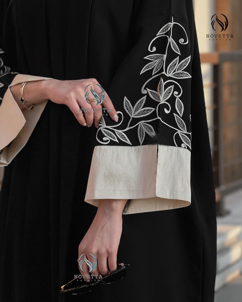 عباية سوداء بكم واسع أوف وايت مطرّز بأغصان الياسمين الفضية، تصميم أنثوي راقي يمزج بين البساطة والفخامة.بخامة حبر اندونيسيوالمقاسات وافية وواسعة
