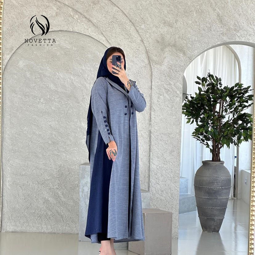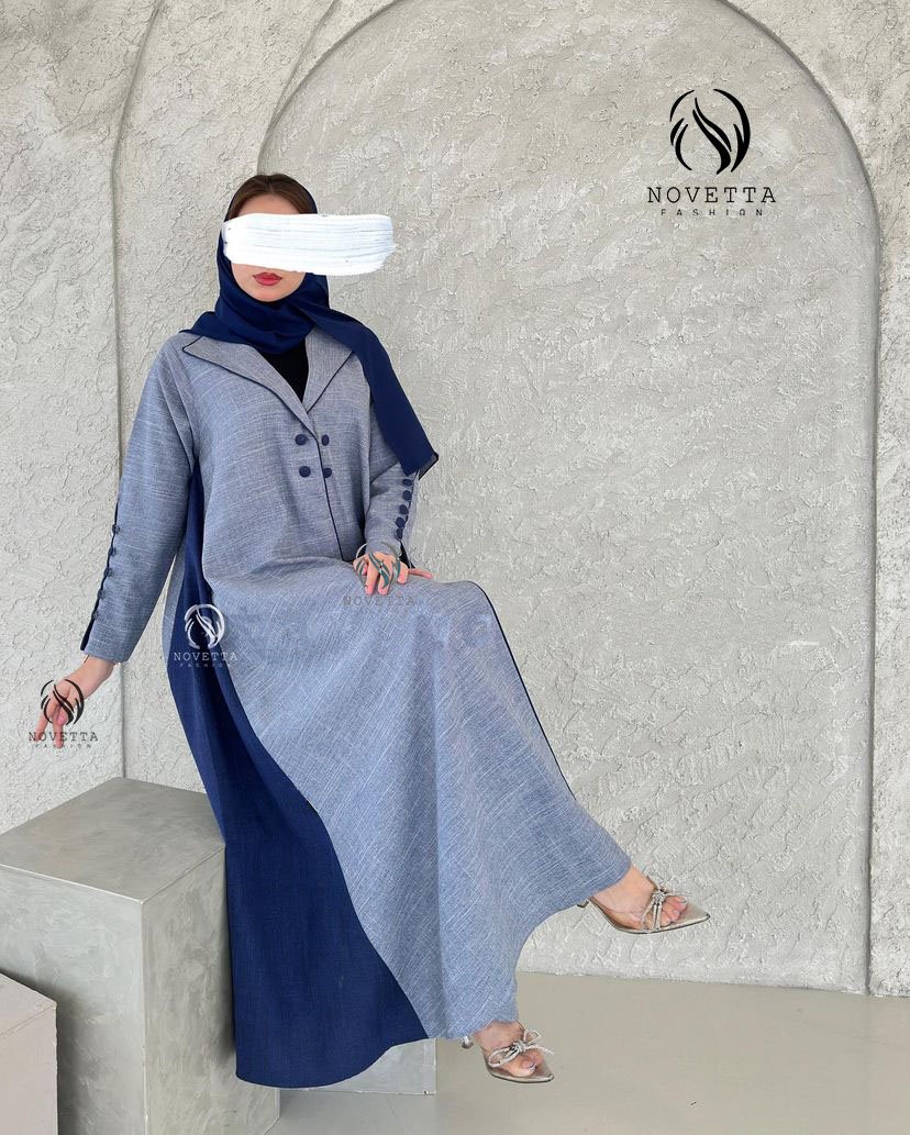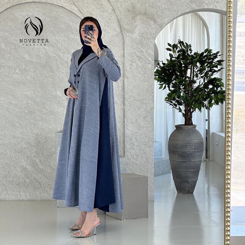 عباية بستايل بليزر أنيق بتداخل لوني رمادي وأزرق غامق مع قصة مثلثية جانبية، تمنحك حضور عصري أنيق بلمسة كلاسيكية مميزة.بخامة ملنج والمقاسات وافية وواسعة
