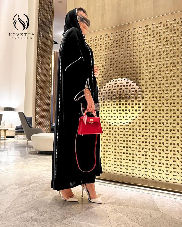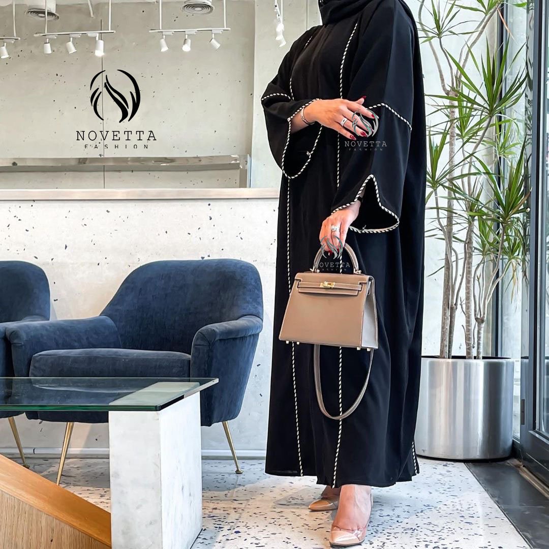 عباية خطوط مقلمة، عبايات سوداء، عبايات فخمة، موديل جديد 2025، عبايات نوفِيتا، عباية عصرية، عباية عملية
