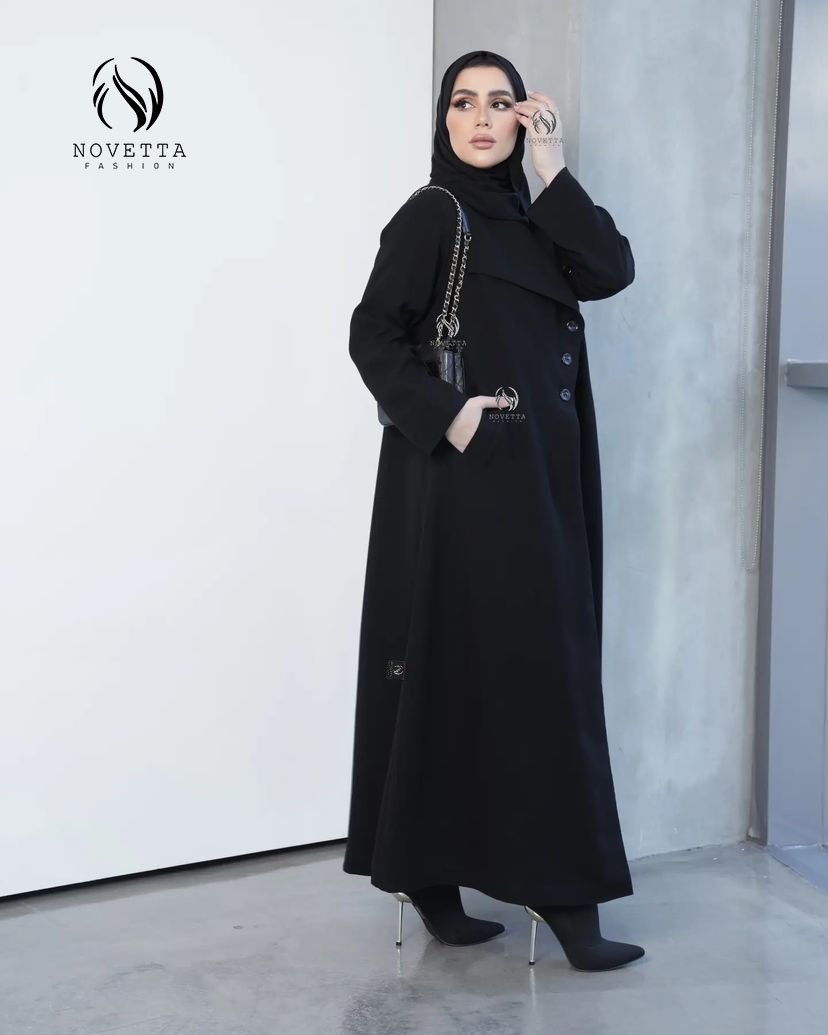 عباية سوداء بتصميم جاكيت كلاسيكي مع ياقة واسعة وأزرار أمامية، لإطلالة تجمع بين الرقي والقوة.بخامة شمواه تقيل والمقاسات وافية وواسعة