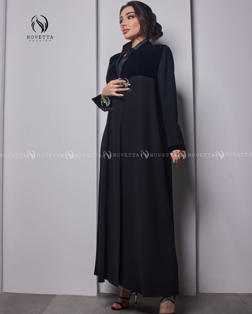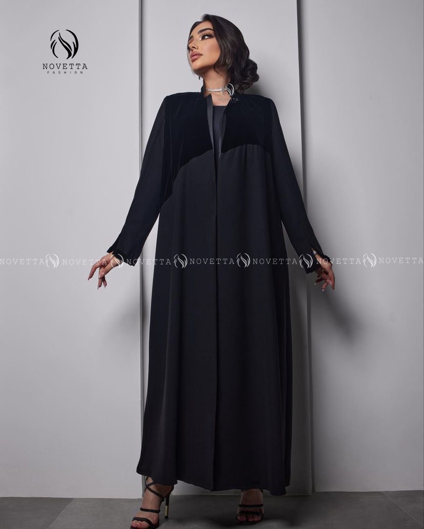 عباية سوداء بتصميم مخملي على شكل زاوية مع ياقة وأكمام ناعمة، تضيف لمسة فخامة وعصرية في إطلالة واحدة.بخامة مخمل اسود و باندوراما
